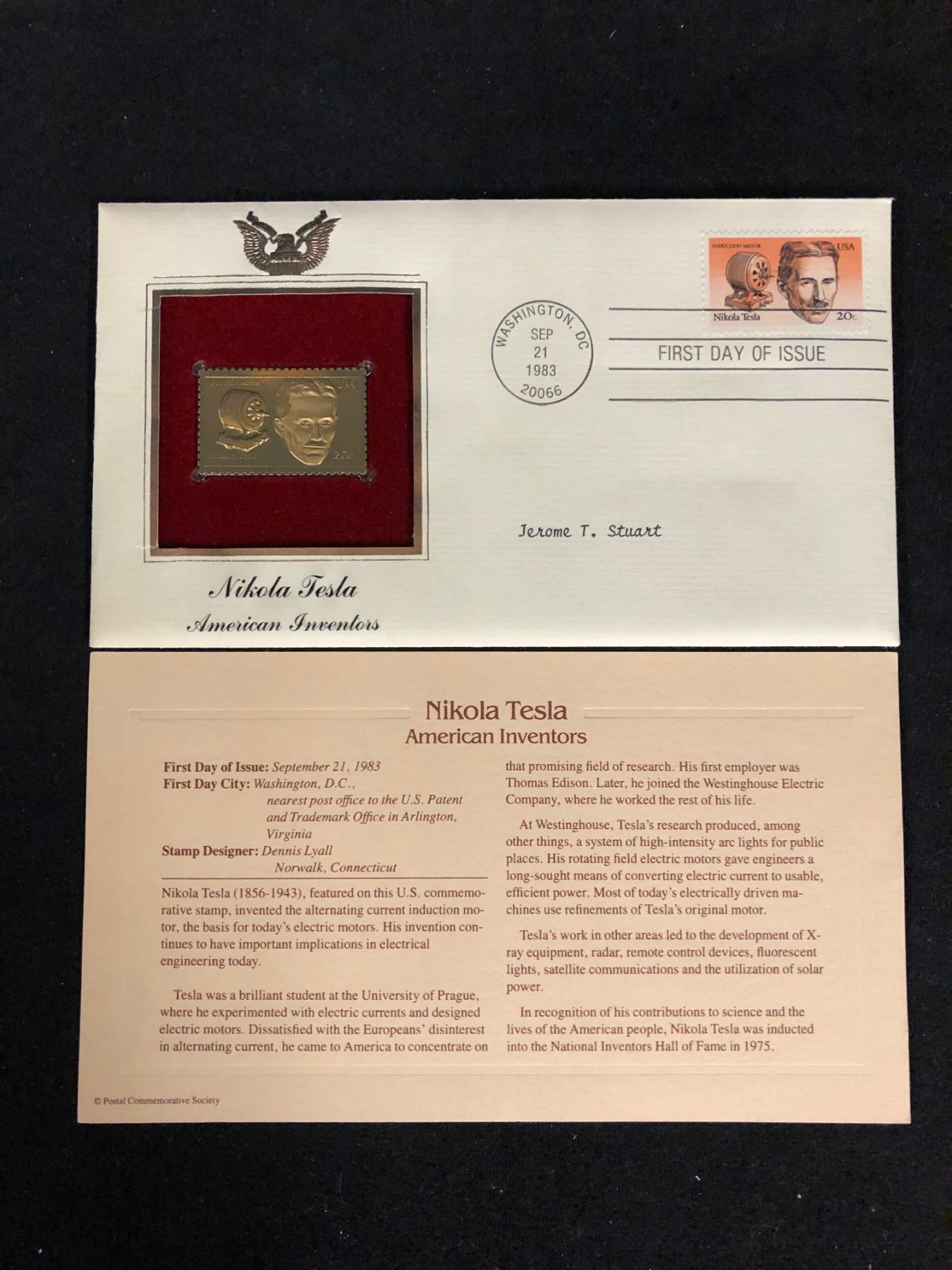 22kt Gold Replica First Day Cover Stamp Nikola Tesla American Inventors
