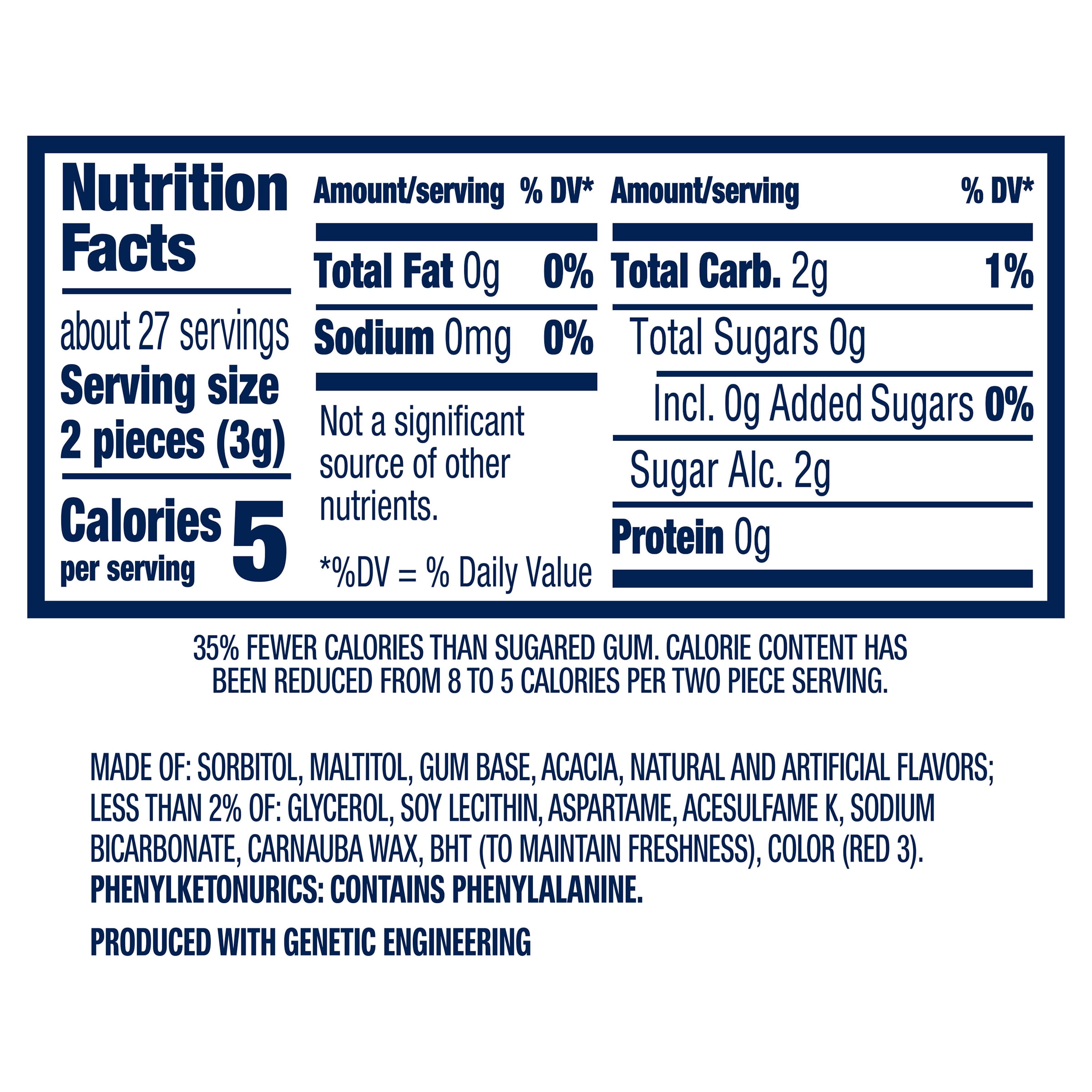 Remove product from packaging. Hydrogenated Starch Hydrolysate Aspartame Mannitol Acesulfame K Soy Lecithin Xylitol BHT to Maintain Freshness Colors Blue 1 Lake Beta Carotene Directions.